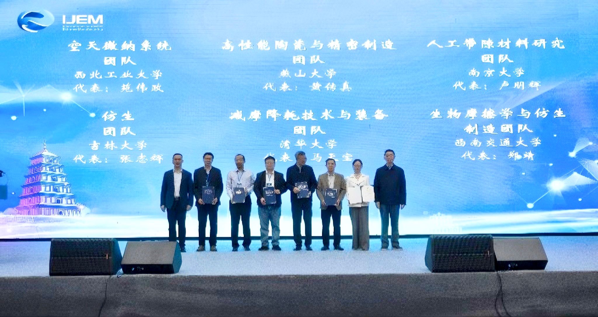 生物摩擦学与仿生制造团队被《极端制造》英文期刊授予突出贡献奖,学校国家优秀青年基金获得者郑靖研究员代表该团队上台领奖,中国工程院院士、大连理工大学前任校长、《极端制造》期刊主编郭东明教授为各位获奖者颁奖。