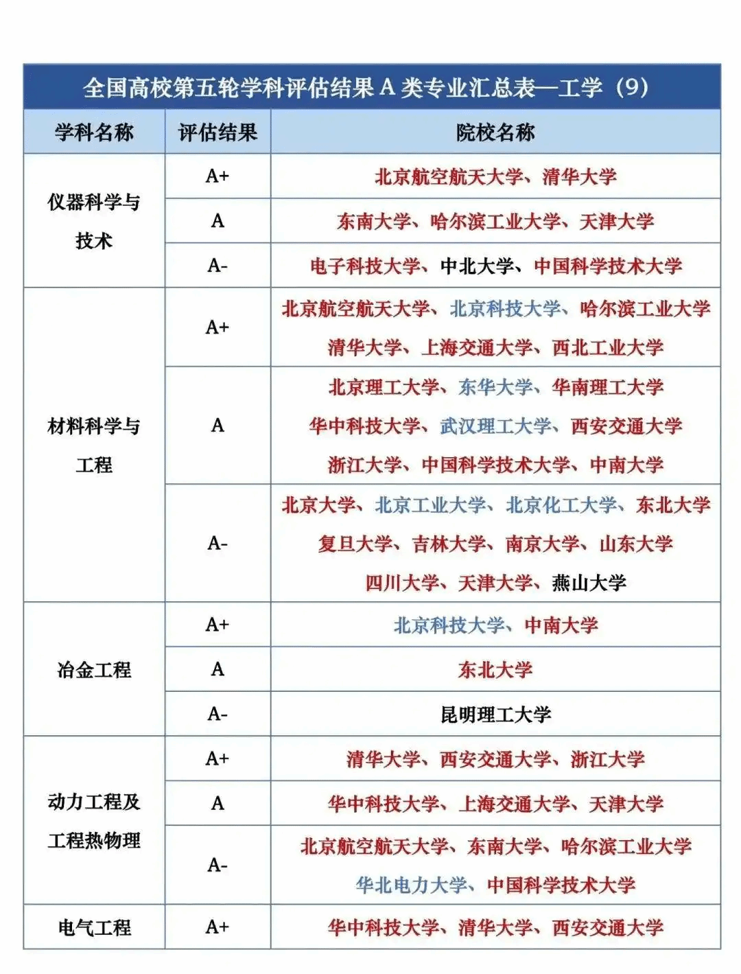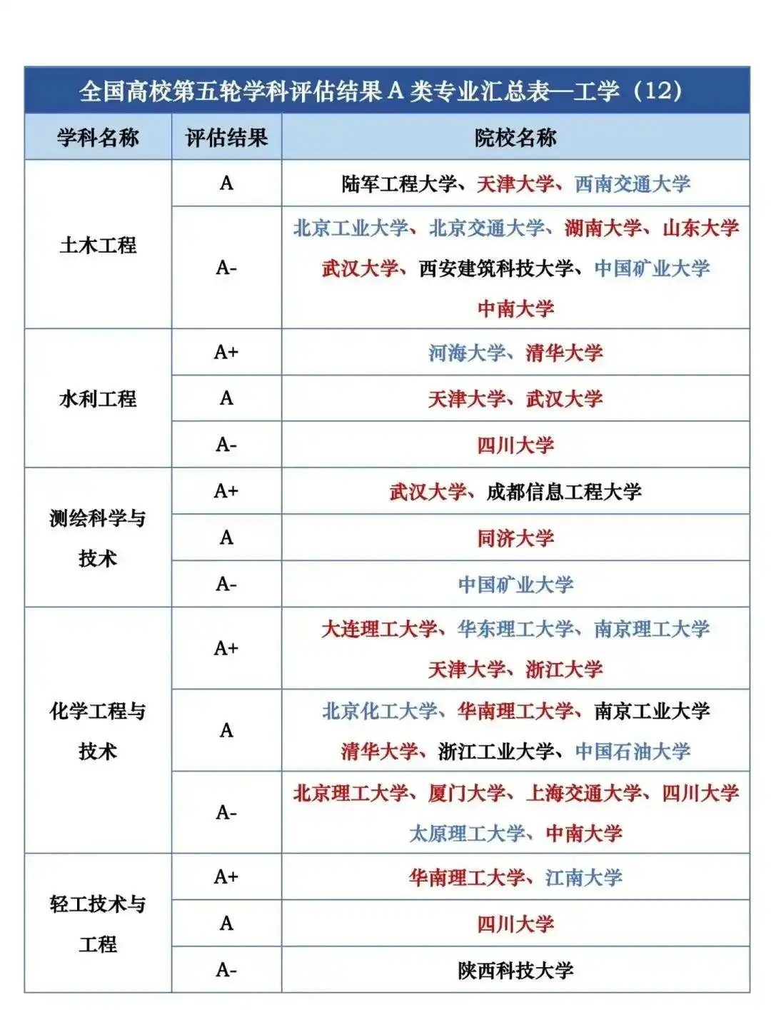 全国高校第五轮学科评估结果A类专业汇总