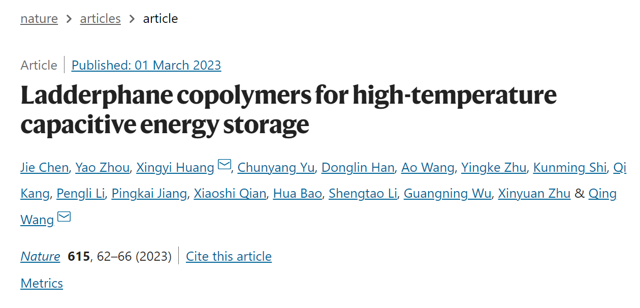 吴广宁教授团队参与完成的科研成果“Ladderphane copolymers for high temperature capacitive energy storage”。该成果是电气工程、化学、材料、工程热物理等多学科的深度交叉融合,由吴广宁教授团队和上海交通大学黄兴溢教授团队等合作完成。