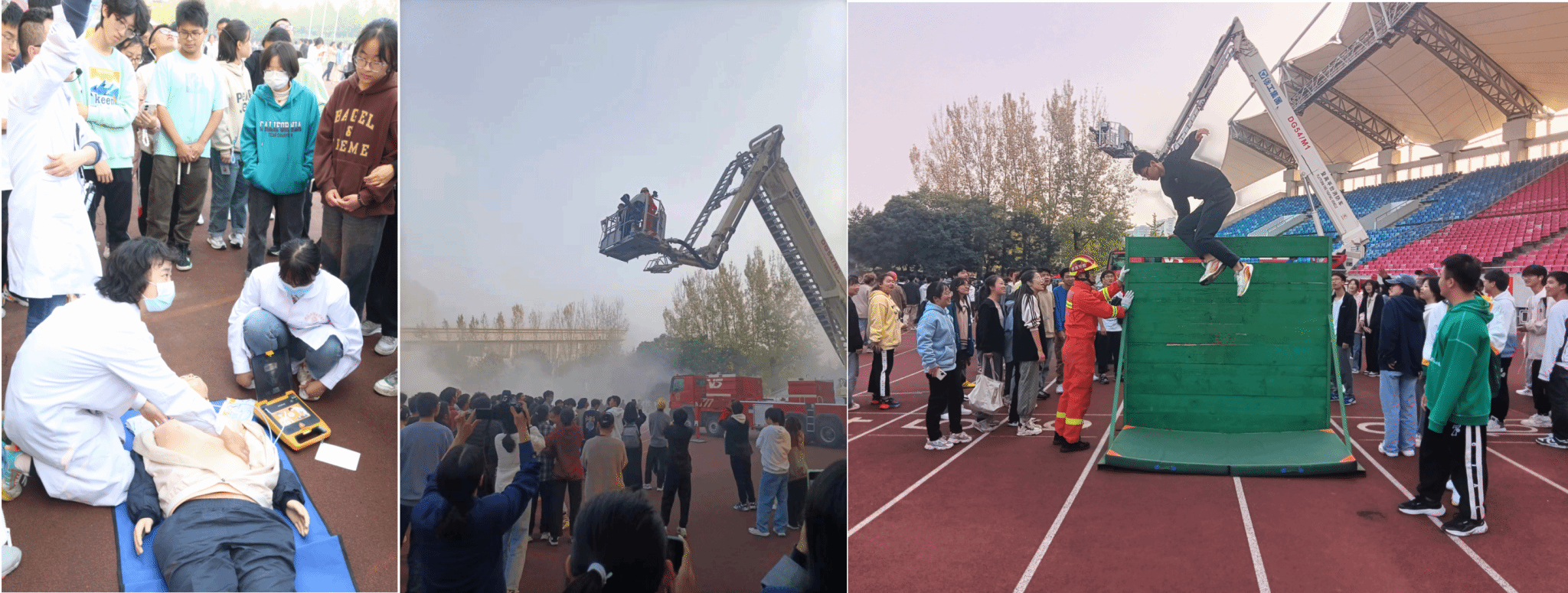 演练第二阶段——消防安全知识学习和消防技能体验活动中,郫都区消防救援大队展示了百米障碍救助操、原地着装甩水带实操项目,同时展示了40余件消防救援器材设备。现场同学们分组进行了灭火器灭火实操体验、心肺复苏急救技能学习、模拟烟雾逃生帐篷、仿真灭火帐篷、VR虚拟体验、消防救援云梯体验、接消防水枪水带学习、平衡板桥体验、越墙体验等项目。现场师生积极参与,真切感受到火场的危险和学习消防安全知识的重要性。