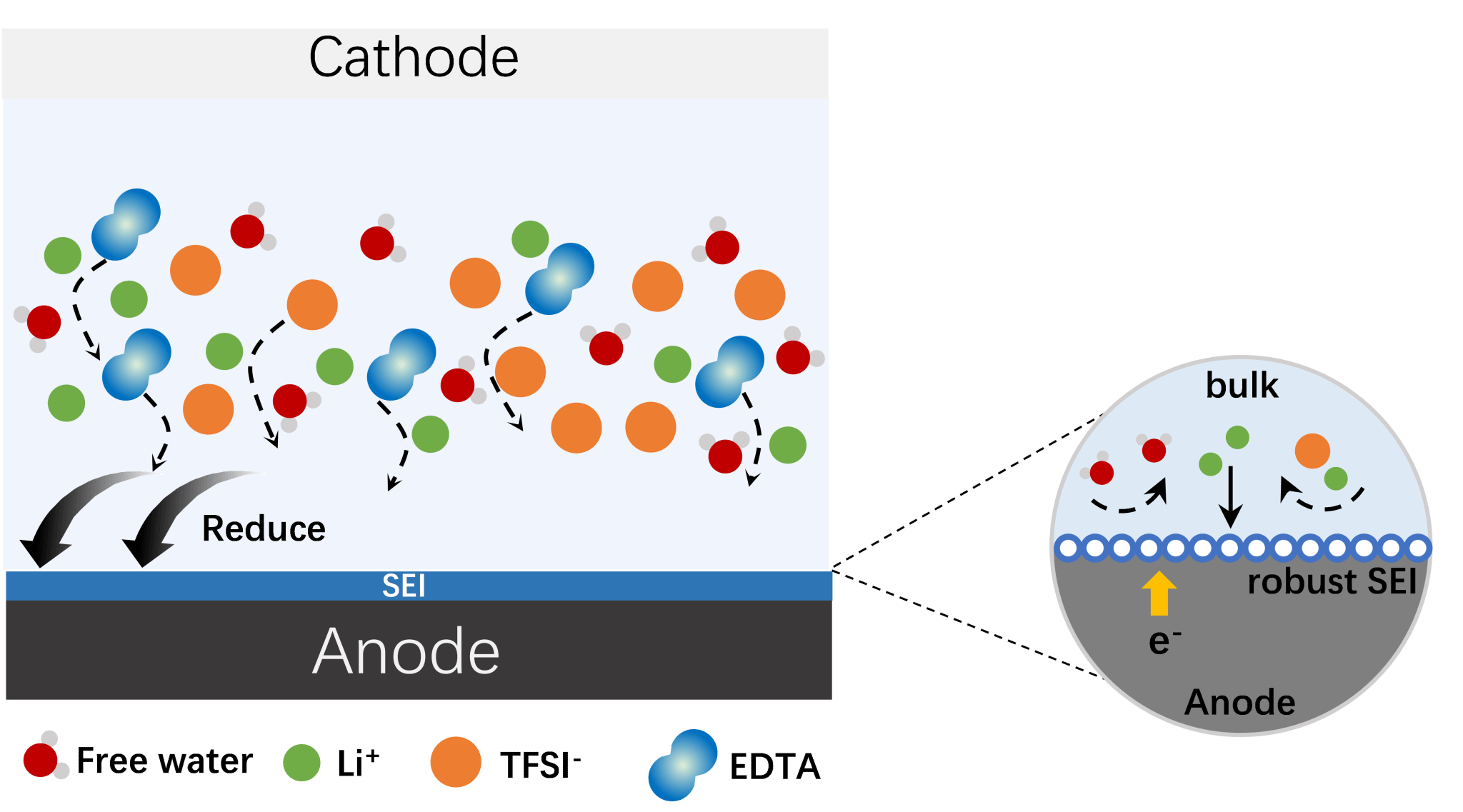 团队创新性地引入乙二胺四乙酸(EDTA)作为功能性添加剂,从分子溶解行为入手,调控高浓度LiTFSI电解质中的溶剂化结构,探明SEI成膜机制。通过实验与多尺度理论计算相结合,揭示了EDTA在高浓度电解质中构建稳定溶剂化结构和致密SEI的关键作用,有效提升了水系锂电池的界面稳定性和循环性能,为新一代高性能水系储能系统开发提供了新策略。
